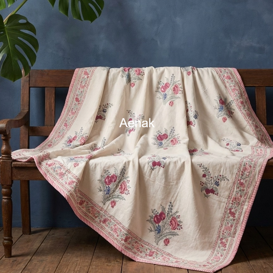 Pink Poppy Handblock Reversible Mulmul Cotton Quilt (Light Beige Base)