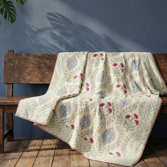 Green & Red Dahlia Handblock Reversible Mulmul Cotton Quilt