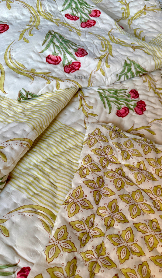 Key Lime Yellow Jaal Handblock Printed Reversible Mulmul Cotton Quilt