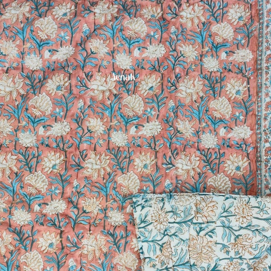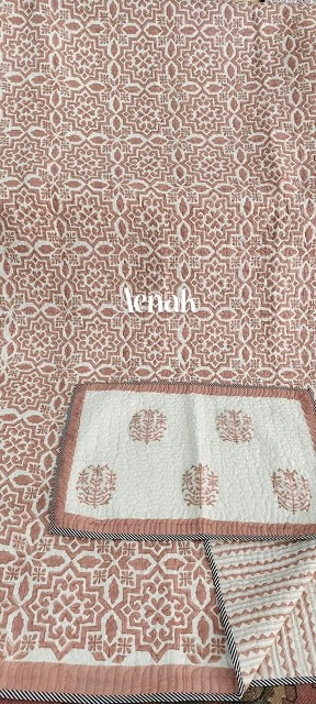 Peachish Brown Jaal Handblock Printed Reversible Quilted Bedcover -105 x108