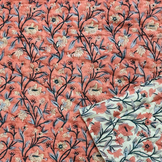 Peach & Blue Garden Handblock Printed Reversible Mulmul Cotton Quilt