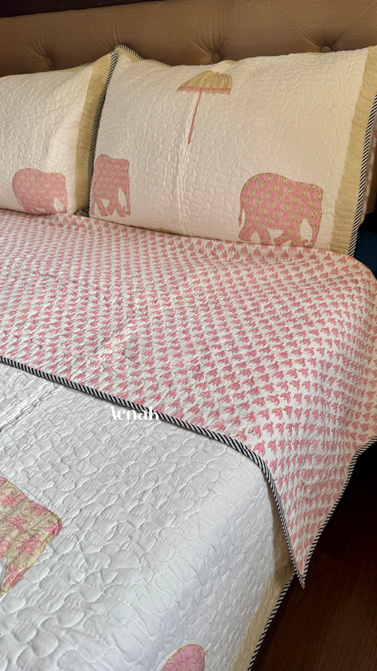 Pastel Pink & Yellow Elephant Handblock Printed Reversible Quilted Bedcover Set