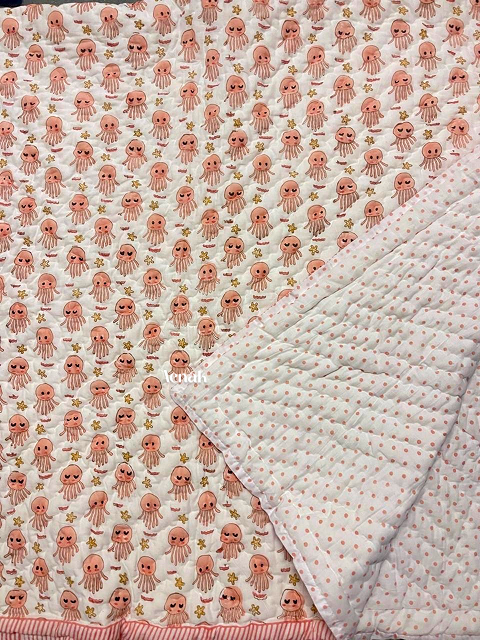 Peach Octopus Handblock Printed Reversible Mulmul Cotton Kids Blanket