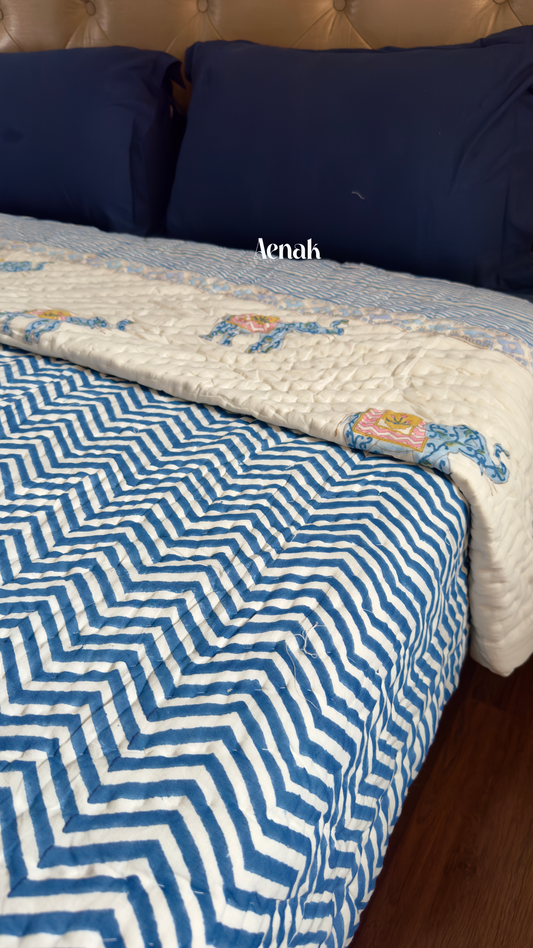 Blue Chevron Elephant Handblock Printed Reversible Mulmul Cotton Quilt