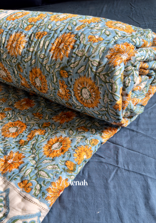 Blue & Yellow Floral Garden Handblock Printed Reversible Mulmul Cotton Quilt