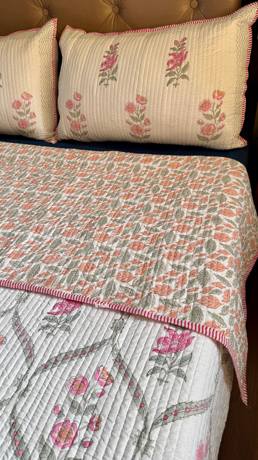 Pink Poppy Handblock Bedsheet + Quilted Bedcover Combo Set (Light Beige Base)