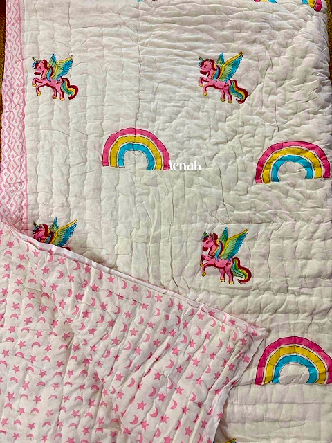 Pink Rainbow Handblock Printed Reversible Mulmul Cotton Kids Blanket