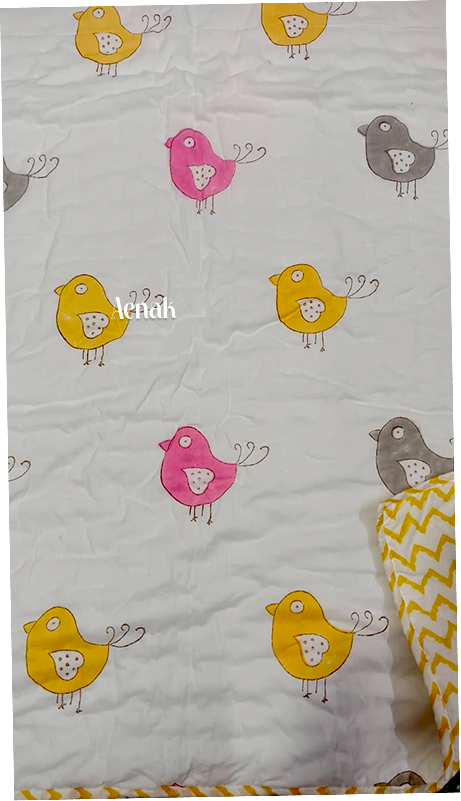 Pink Yellow Bird Handblock Printed Reversible Mulmul Cotton Kids Blanket