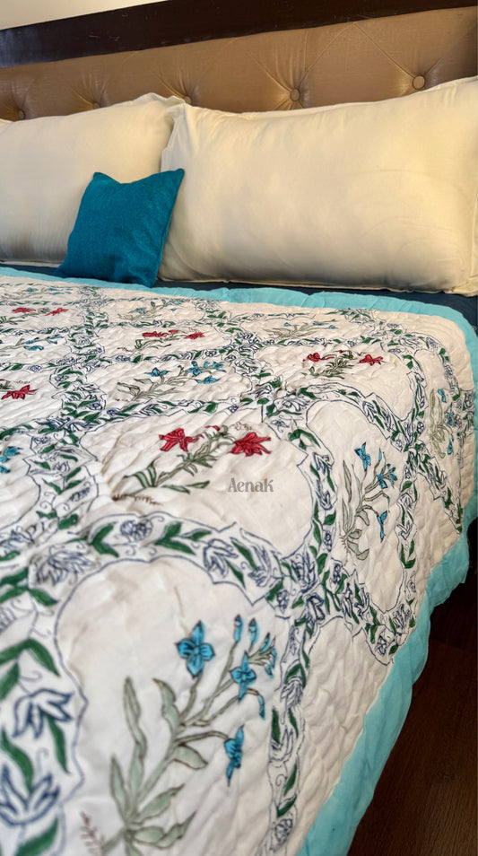 Red & Blue Floral Jaal Handblock Bedsheet + Quilt Combo