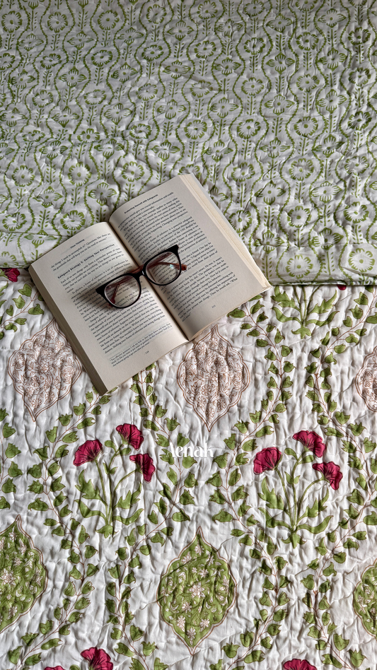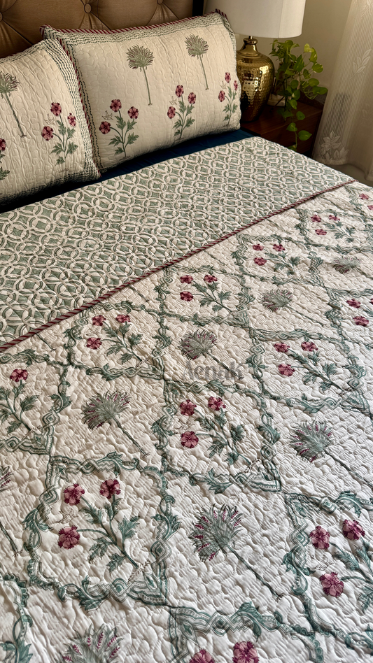 Sage Green Jaal Handblock Printed Reversible Quilted Cotton Bedcover Set