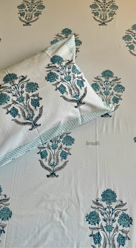 Teal Blue Dahlia Handblock Printed Premium Cotton Bedsheet Set