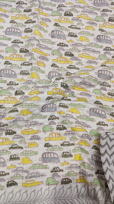 Yellow Car Handblock Printed Reversible Mulmul Cotton Kids Blanket