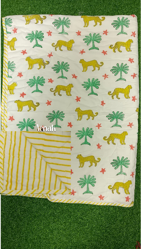 Yellow Leopard Handblock Printed Reversible Mulmul Cotton Kids Blanket