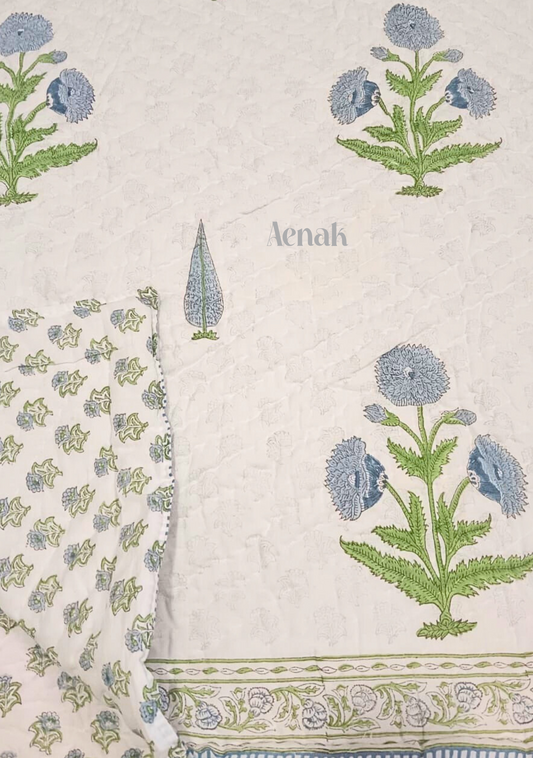 Blue Dahlia Handblock Bedsheet + Quilted Bedcover Combo Set