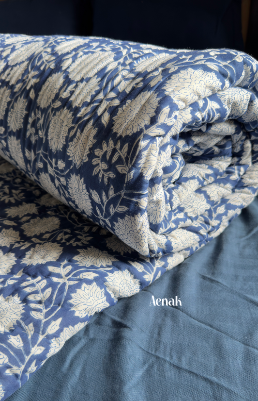 Blue Floral Garden Handblock Printed Reversible Quilted Bedcover -105 x108