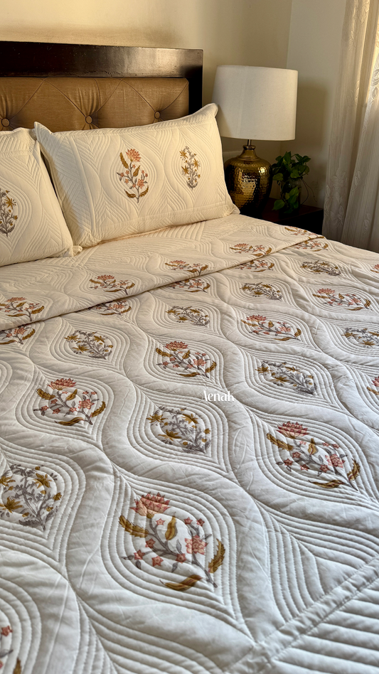 Beige Embossed Handblock Quilted Bedcover Set (Non-White Base)
