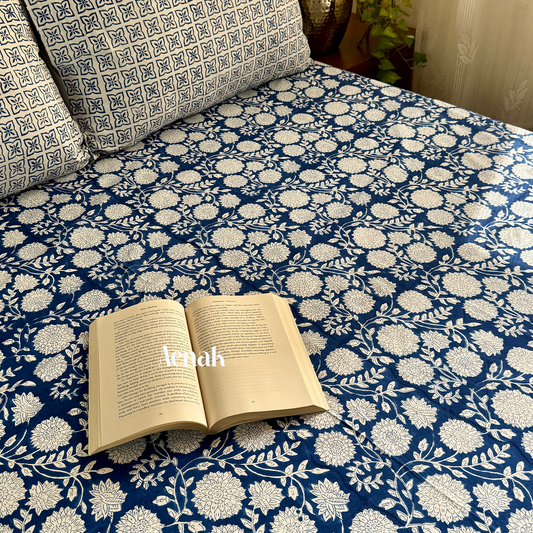 Blue Phool Boota Handblock Bedsheet + Quilt Combo Set
