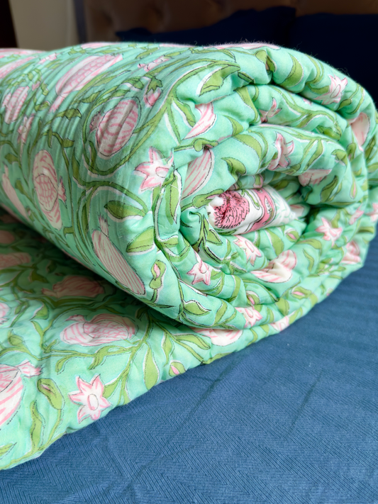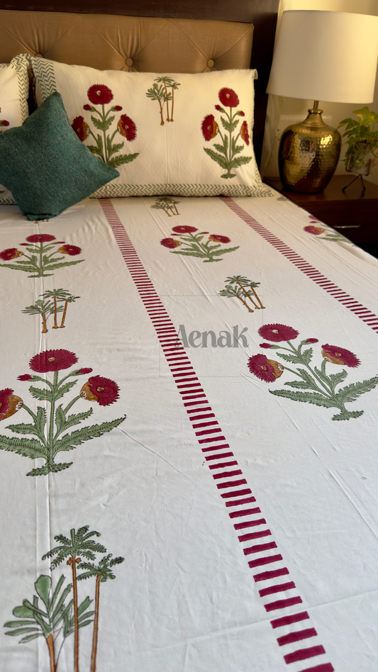 Green & Red Dahlia Handblock Bedsheet + Quilt Combo Set