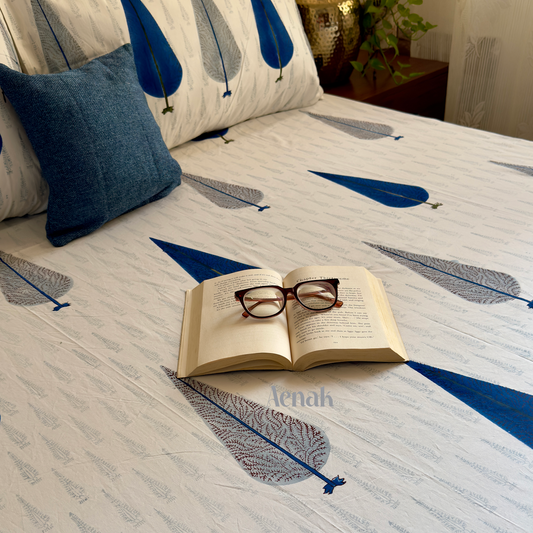Blue Periwinkle Handblock Bedsheet + Quilt Combo Set (Beige Base)