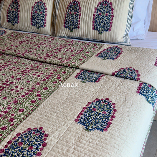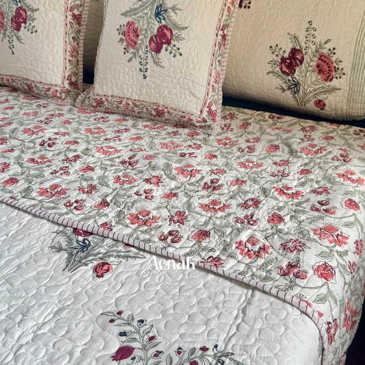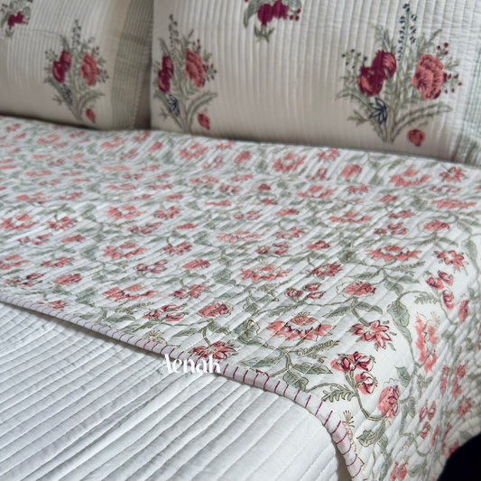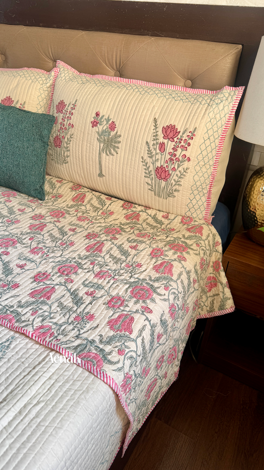Pink & Green Cotton Bud Handblock Bedsheet + Quilted Bedcover Combo Set