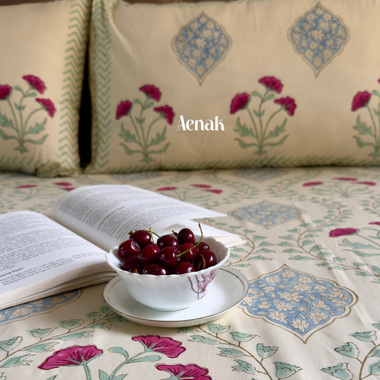Pink Poppy Handblock Bedsheet + Quilted Bedcover Combo Set (Light Beige Base)