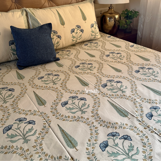 Blue Periwinkle Handblock Bedsheet + Straight Quilted Bedcover Combo Set (Beige Base)