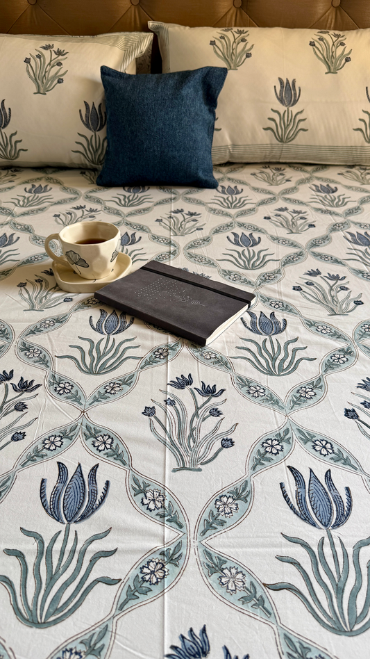 Blue Lotus Handblock Bedsheet + Straight Quilted Bedcover Combo Set