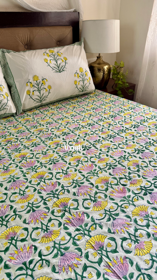 Pink Yellow Lotus Handblock Bedsheet + Quilted Bedcover Combo Set