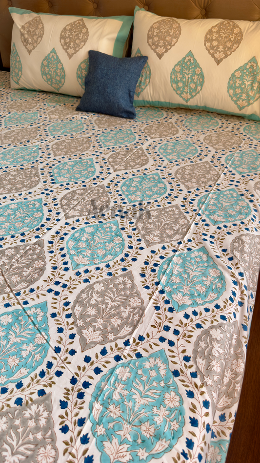 Teal Blue Handblock Bedsheet + Quilted Bedcover Combo Set