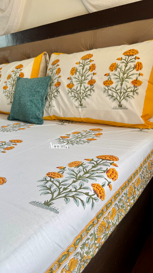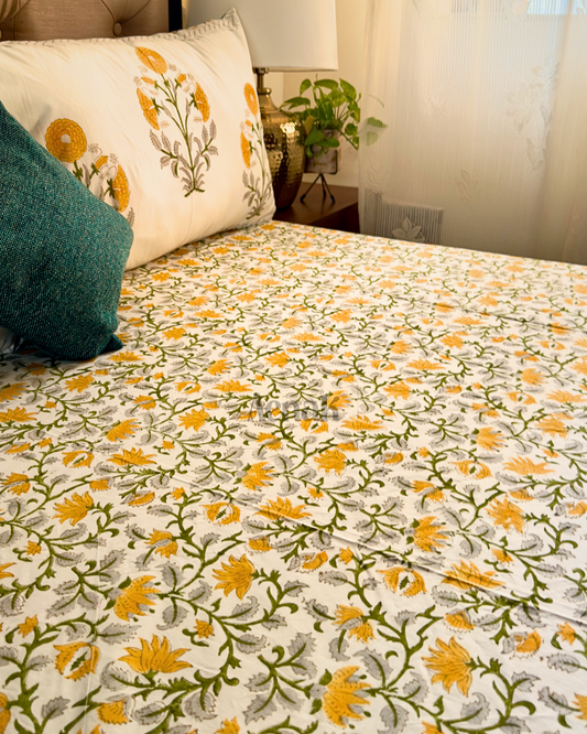 Turmeric Yellow Marigold Handblock Bedsheet + Dohar Combo