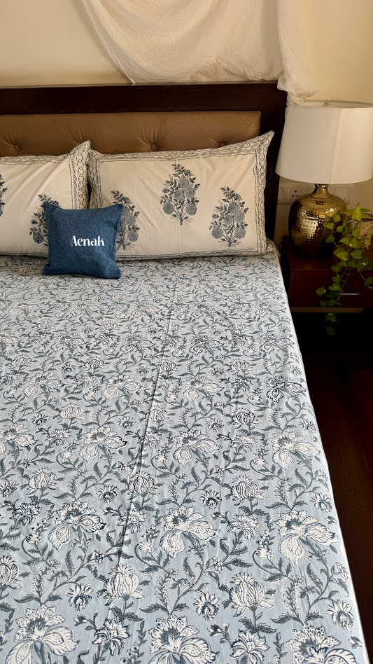 Blue Phool Boota Handblock Bedsheet + Dohar Combo