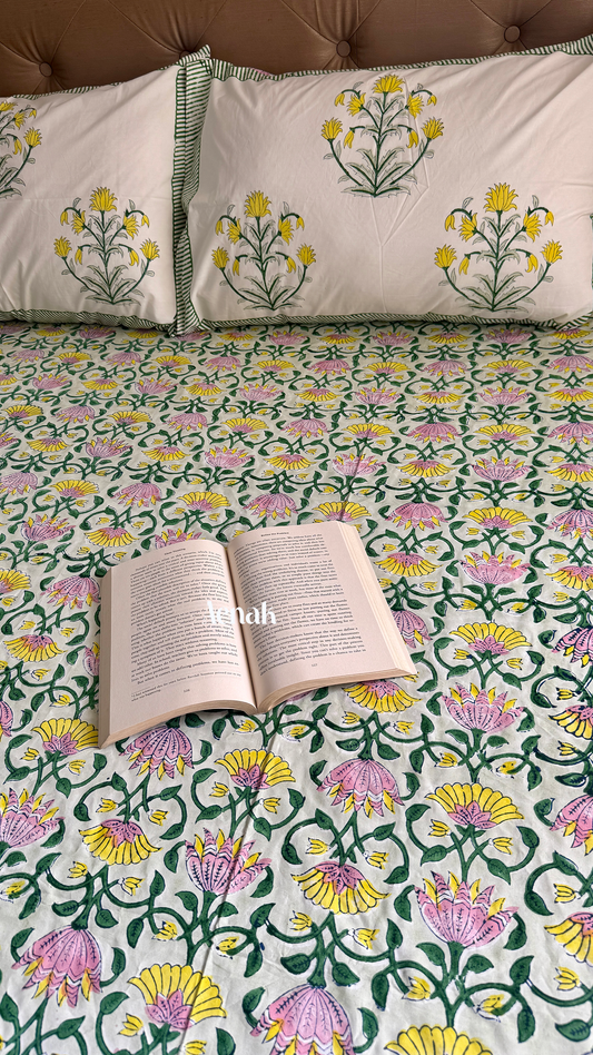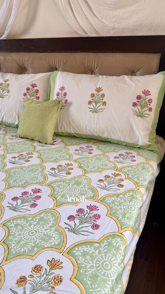 Mint Green & Yellow Handblock Bedsheet + Dohar Combo
