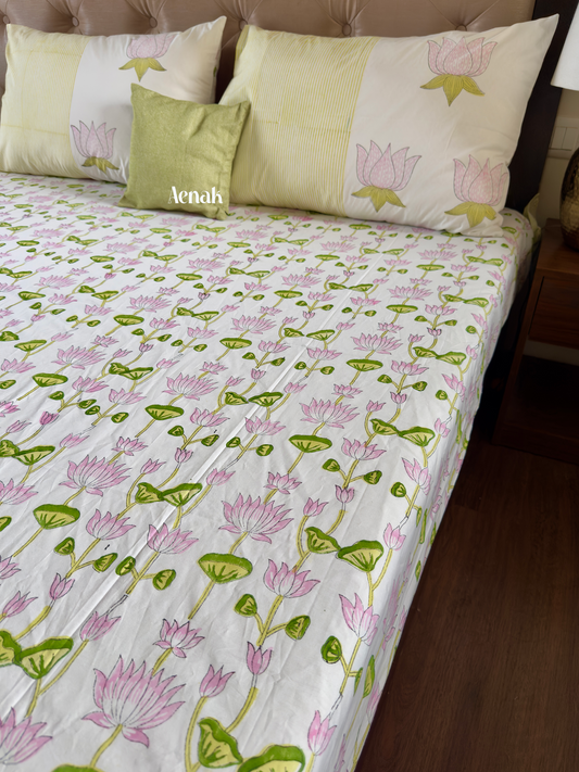 Pink & Yellow Lotus Handblock Bedsheet + Dohar Combo