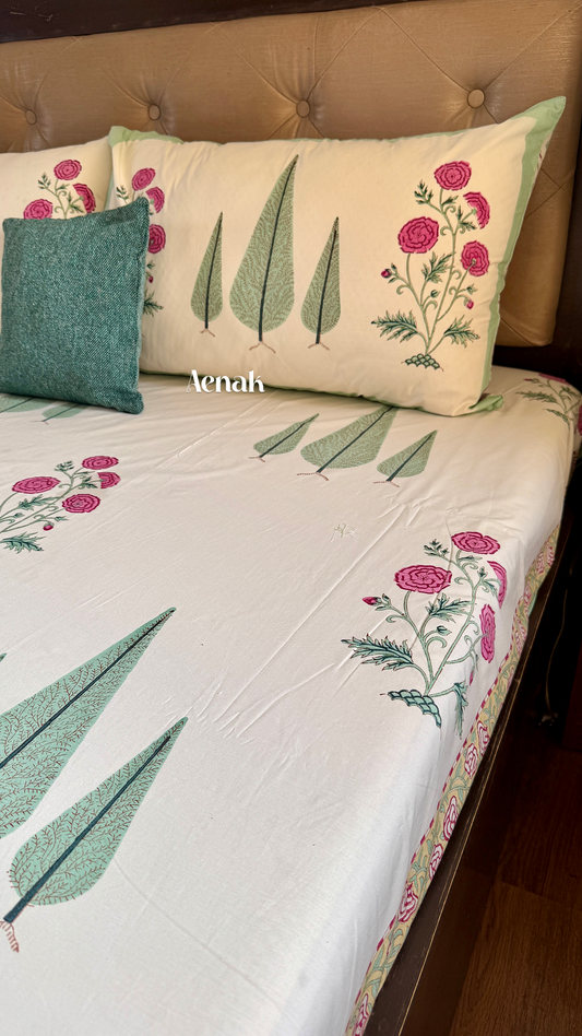 Green Ashoka Handblock Bedsheet + Dohar Combo