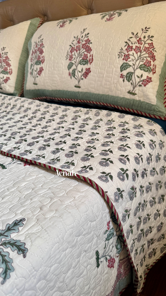 Pink Floral Green Palm Handblock Printed Reversible Quilted Bedcover Set