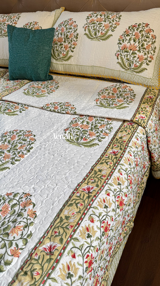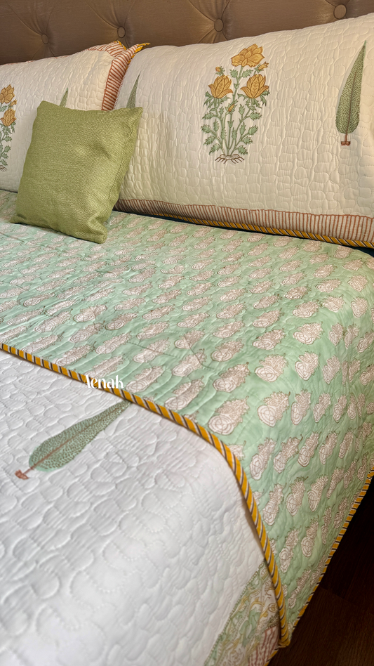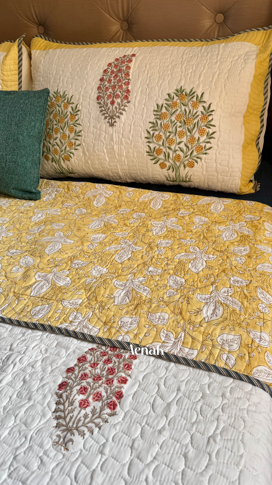 Yellow Phool Boota Handblock Printed Reversible Quilted Bedcover Set