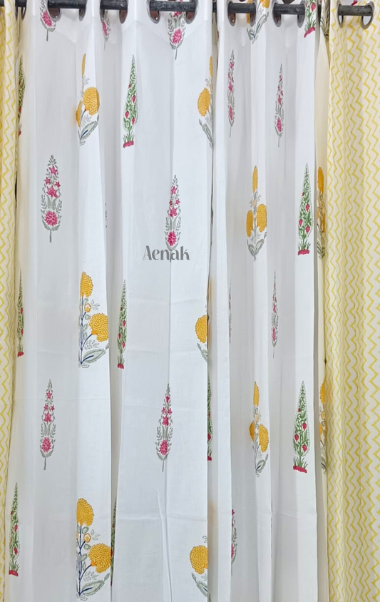 Yellow Pink Marigold Eyelet Handblock Curtains
