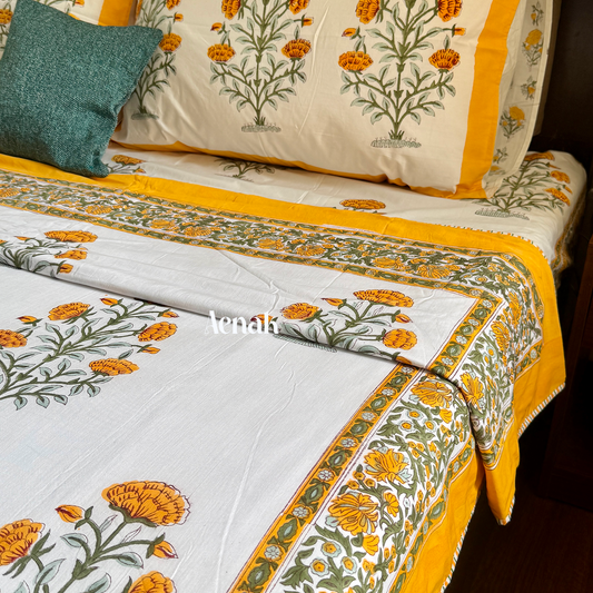 Yellow Marigold Handblock Mulmul Cotton Reversible Dohar