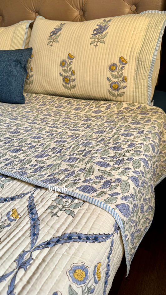 Blue Periwinkle Handblock Bedsheet + Straight Quilted Bedcover Combo Set (Beige Base)