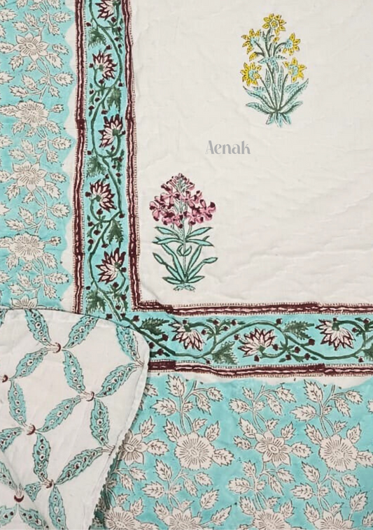Blue Dahlia Handblock Bedsheet + Quilt Combo