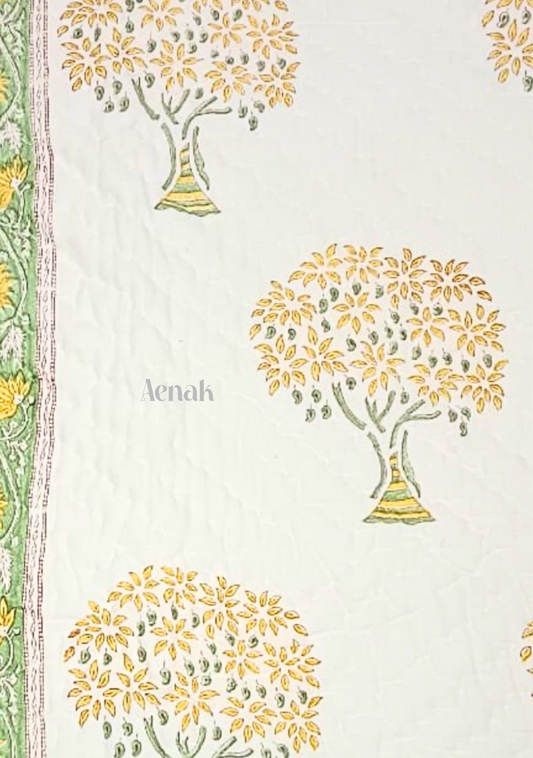 Yellow Bodhi Tree Handblock Bedsheet + Quilt Combo
