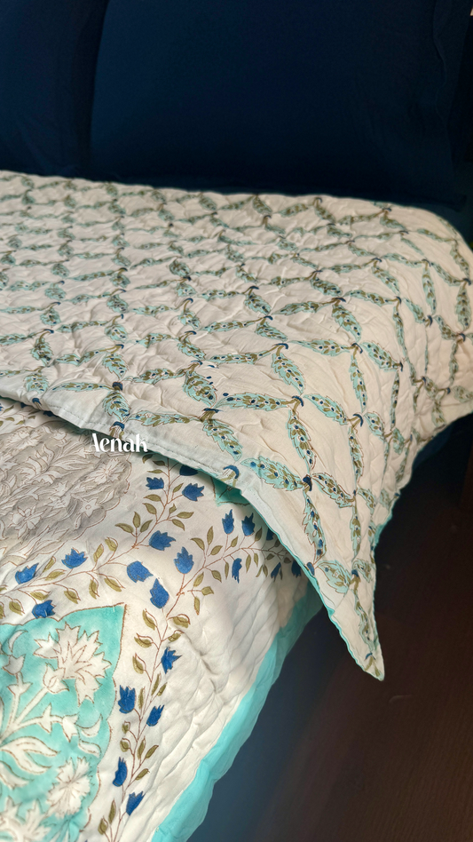 Teal Green Cypress Jaal Handblock Bedsheet + Quilt Combo