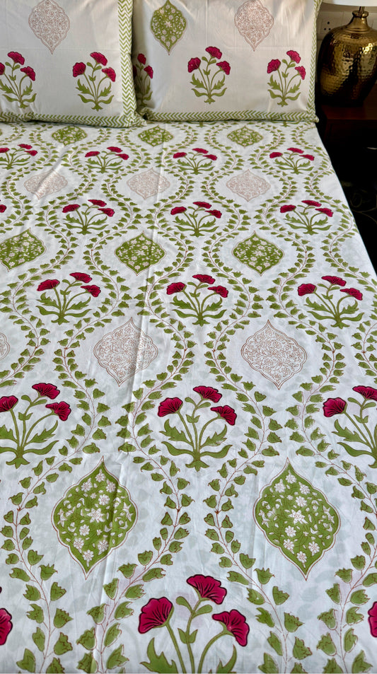 Green Jaal Handblock Bedsheet + Quilt Combo