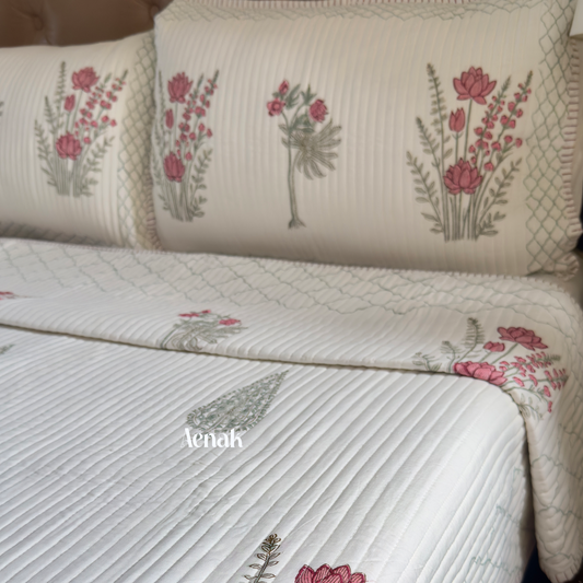 Pink & Green Cotton Bud Handblock Reversible Quilted Bedcover Set
