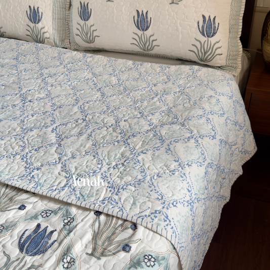 Blue Lotus Handblock Reversible Quilted Bedcover Set