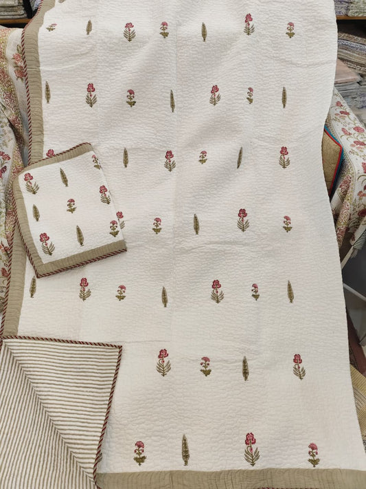 Gulab Booti Handblock Reversible Quilted Bedcover Set