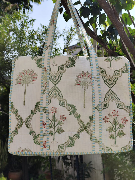 Green Jaal Quilted Cotton Zipper Travel Bag