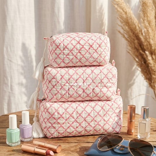 Pink Jaal Quilted Vanity Pouches-Set of 3