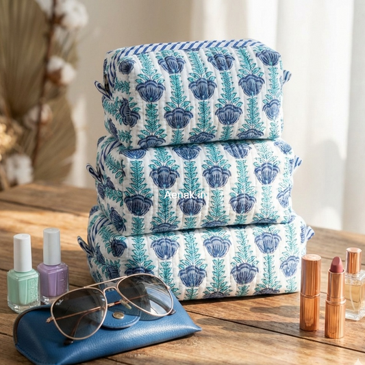 Teal Blue Jaal Quilted Vanity Pouches-Set of 3