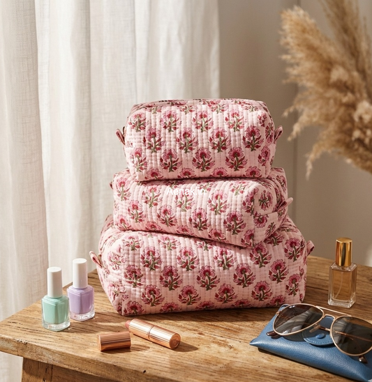 Pink Phool Quilted Vanity Pouches-Set of 3